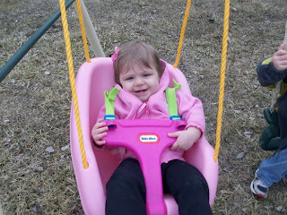 We finally had a nice day outside and I had promised Cooper that we could play on his swing set. The ground is still VERY wet, so Maylea couldn't play in the grass, and I didn't want to hold her the whole time SOOOO, we went to Walmart and bought Maylea a swing. She was going to get one from Santa, but we couldn't find any at Christmas time. I would have held off until her birthday, but with the nice weather coming, I didn't want to wait a month and a half.